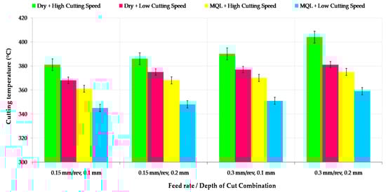 - Temperatures are relatively lower (358 °C) in the MQL environment which provides good transportation of cutting fluid at the cutting region, especially the tool-chip interface. At low cutting speeds, the temperature drops to 345 °C degrees. Results showed that the cutting speed was the most influential parameter on tool tip temperature.