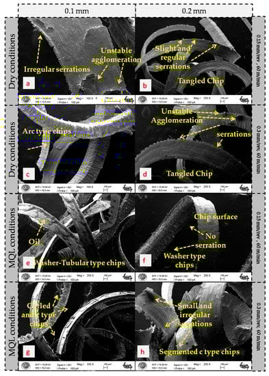 The size, shape, and texture of chips produced during a machining process can reveal important information about the cutting conditions, tool geometry, and material properties. Chip morphology and other cutting parameters can serve as useful indicators of machining quality, process stability, and material behavior. By monitoring and optimizing these factors, manufacturers can improve the productivity, consistency, and profitability of their machining operations. General and extended SEM views are given in Figure 5. Bright light areas in samples collected from MQL media are due to the existence of oil droplets on the surface of the chips. In addition, material accumulation is seen on the chip surface for a similar reason. The plastic deformation that occurs with the influence of increasing temperature causes the radius of curvature of the chip to increase during dry machining, Figure 5a–d. Arc chips are formed in high feed rate and high cutting speed conditions in dry medium in Figure 5a,c. Uniform thickness and continuous-tangled shape chips are formed for higher cutting depth values in Figure 5b. Long-washer-type helical chip shapes were observed under MQL medium during low cutting speed. As is seen in Figure 5a,b chips are less curled as compared to high feed rates in dry conditions. While chips more curled in low feed rate MQL-assisted turning conditions. Smooth surfaces and long-washer-type chips indicate a sharp cutting edge and a ductile material traces. On the other hand, segmented chips with a serrated surface are observed in high cutting speed dry and MQL in Figure 5h.
