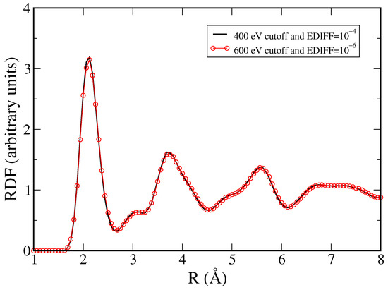 Electronic structure calculations [37,38,39] were performed with a plane wave set corresponding to a 400.0 eV energy cut-off, and the electronic iterations were converged to within eV. These parameters are routinely used by many research groups, including the authors of the present work. Nevertheless, we checked the convergence by running AIMD with the 600.0 eV energy cut-off and the convergence on electronic iterations within eV. Note that for a system size of the order of 1000 atoms, such convergence is extreme, and it took about 40 electronic iterations at each AIMD step. Despite such extreme parameters, the radial distribution functions (RDF), computed using two sets of parameters, were identical (Figure 1). This suggests that our calculations are converged for the chosen cut-off energy as well as for the parameters for the precision of electronic calculations.
