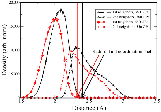 We define the radius of the first coordination shell as the radius of a sphere that contains the eight nearest neighbors in the bcc structure. In the ideal 0 K bcc lattice, the atom in the center of the cube has eight nearest neighbors in the corners of the cube. Unfortunately, the 0 K model of the bcc lattice was used by the experimentalists to rule out the bcc phase. The claim for the eight-coordinated bcc Fe at high P–T conditions is off by a big margin. In the ideal bcc lattice, it is true, of course. However, the situation is drastically different at high P–T. An Fe atom in the bcc lattice has eight nearest neighbors and six neighbors at a somewhat larger distance. When the thermal motion is accounted for, the difference between the first and second coordination shells is not as straightforward. As a result of thermal motion, the first coordination shell radius increases—indeed, it should include all first eight neighbors, and these neighbors are now moving, resulting in the appearance of both shorter and longer distances. Those longer distances become the effective radius of the first coordination shell because the first coordination shell has to confine all eight atoms. The second coordination shell is also spread in space, forming both shorter and longer distances between the central atom and the atoms in the second coordination shell. Some of these distances are shorter than the radius of the first coordination shell, and these atoms effectively enter the first coordination shell. Figure 2 shows the histogram of the distances to the eight atoms in the first coordination shell and the six atoms in the second coordination shell.