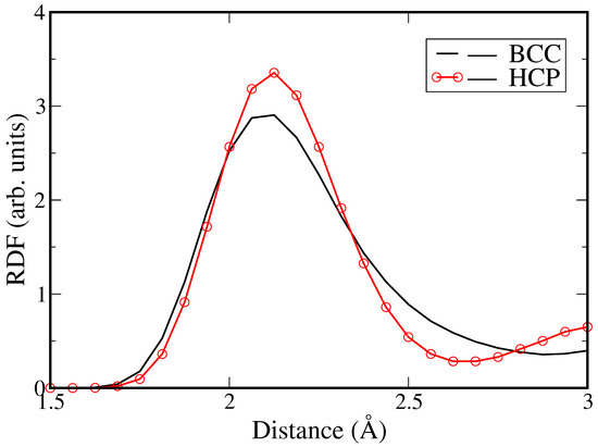 The structure of the phases was monitored by calculating the radial distribution function (RDF). The AIMD runs durations were normally about 8000 timesteps. The AIMD runs were performed for -point only. At the sizes of the supercells we use, the -point is sufficient. Finite temperatures for the electronic structure and force calculations were implemented within the Fermi–Dirac smearing approach [40]. In all our AIMD runs, we used the VASP [38,39] software package.