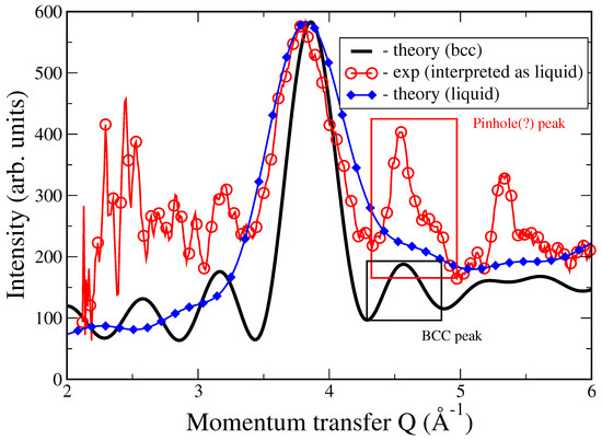 Now, we have three peaks in the range of Q as indicated in Figure 4 and Figure 5. One can observe immediately the intensities of the pinhole peaks reported in the measurements of the presumably liquid phase in Figure 4 and the presumably hcp phase in (Figure 5). Of course, the intensities are provided using arbitrary units, but it is expected that those are still the same units. The intensities might be affected by the somewhat different conditions; however, the authors reported that these conditions were very close in these two cases. Let us do the following. We plot the pinhole peaks in a separate figure (Figure 6). We also plot the computed bcc peak as boxed in Figure 4 in the same figure. Now, we add the intensity of the pinhole peak from the spectrum collected for hcp (undoubtedly pinholes are only involved there) to the computed bcc peak. We have to strip the bcc peak from the intensity of the background to not to account for it twice.
