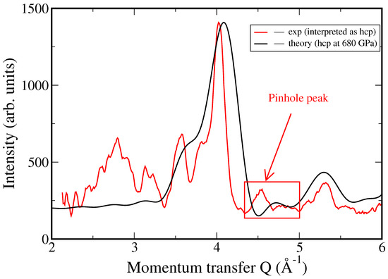 In this figure, we can observe the experimental spectrum of hcp iron compared to the computed hcp spectrum. The spectrum computed at the reported experimental conditions of P = 550 GPa and T = 9000 K was a poor match to experiment. This is in contrast to the comparison depicted in Figure 4. However, the spectrum computed at a higher pressure and lower temperature (Figure 5) in the P–T range of bcc stability [11] fits the experimental spectrum reasonably well. We see that the pinhole peak at the same Q as in the case of the presumably liquid spectrum (Figure 4) does not overlap with any computed peaks. Therefore, we can safely assume that the intensity of that pinhole peak is not affected by iron peaks.