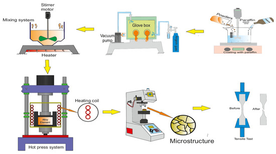 The Powder Metallurgy (PM) technique is commonly used to produce composite materials as it allows for homogenous distribution of reinforcing elements, resulting in superior properties [25,63]. This involves mixing the matrix and reinforcement elements, compressing them in a metal mold, and sintering at a certain temperature in a protective gas atmosphere [64,65]. The relative density measurements of produced samples or pore ratio in the microstructure determine the success of the sintering process [66]. The hot-pressing method has been shown to yield higher relative density values compared to traditional PM methods [67,68]. However, when producing Mg matrix composites, it is crucial to prevent oxidation of Mg powders by coating them with paraffin and debinding them before the Hot Pressing (HP) process.