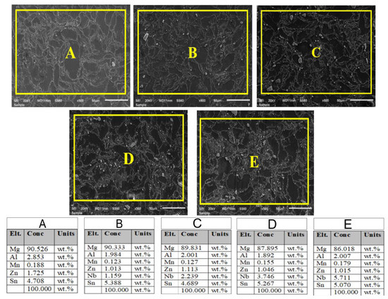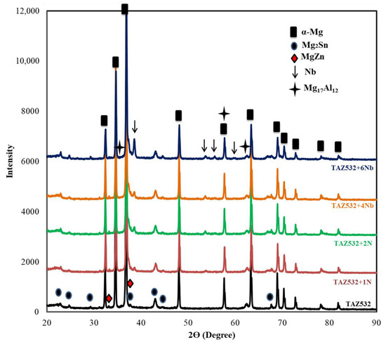 - The X-ray diffraction (XRD) analysis confirmed the presence of α-Mg, Mg2Sn, and Mg17Al12 phases in all composite samples, while the Nb phase was observed only in specimens with Nb reinforcement. The intensity of Nb-related peaks increased with higher Nb reinforcement ratios, reaching the highest values in samples with a weight ratio of 6 wt.% Nb addition.