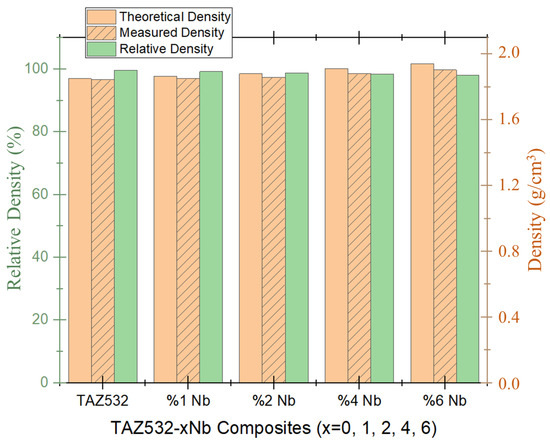 Theoretical, measured, and % relative density values of TAZ532–xNb composite samples.