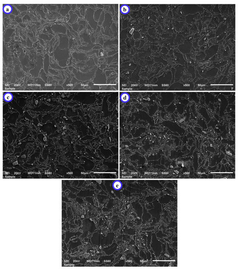 SEM images of TAZ532–xNb composite samples: (a) TAZ532 matrix, (b) 1 wt.% Nb-reinforced, (c) 2 wt.% Nb-reinforced, (d) 4 wt.% Nb-reinforced, (e) 6 wt.% Nb-reinforced.