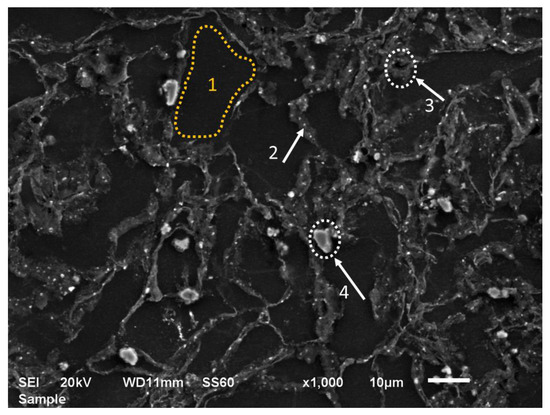 The SEM image, taken at ×1000 magnification, of the TAZ532 matrix composite containing 2 wt.% Nb by weight is provided in Figure 5. Concentrated at the grain boundaries, intermetallic phases and reinforcement particles such as niobium (Nb) serve to bolster the material’s structure, playing a pivotal role in improving its mechanical properties. In our previous knowledge [6,15,73,75], the α-Mg structure is conspicuously situated within the intergranular regions, often discerned via its distinctive black to dark gray pigmentation, an identifier designated as (mark 1) for clarity and communication efficiency. Transitioning to the structural elements labeled as (mark 2), these are present directly on the grain boundary. These formations exhibit a striking, white coloration and are laden with a high concentration of both Mg and Sn. Upon rigorous evaluation using X-ray diffraction (XRD) analytical methods, these particular structures have been definitively categorized as belonging to the Mg2Sn phase, a compound of particular interest. Advancing to the (mark 3) designation, this involves a structure that distinctly resides on the grain boundary and is conspicuous by its uninterrupted, linear form. It bears a dark gray color, indicative of its composition. This structure is found to be rich in Mg and Al, hence aligning it with the Mg17Al12 phase. This phase is a critical component of Mg–Al-based alloys, which are lauded for their superior mechanical properties and broad utility in numerous structural applications. The structures of mark 4 significantly contrasted on the grain boundaries are distinguished by both large and small geometric formations that bear a stark, white coloration. Composed primarily of niobium (Nb) particles, they reflect the inherent characteristics of this transition metal, notable for its high melting point and superior mechanical properties.