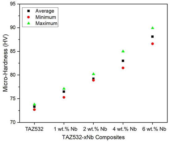 The microhardness values of the TAZ532–xNb composite samples are presented in Figure 7, providing insights into the mechanical properties of the composites. The average microhardness values for the composite samples, which contain different weight ratios of Nb reinforcement (0 wt.%, 1 wt.%, 2 wt.%, 4 wt.%, and 6 wt.%) within the TAZ532 matrix alloy, were determined as 73.3, 76.5, 79.2, 83.0, and 88.1 HV, respectively.