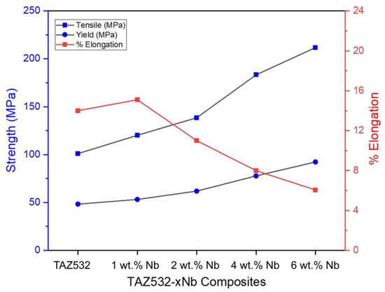 Yield strength, tensile strength, and % elongation values of TAZ532–xNb composite specimens.