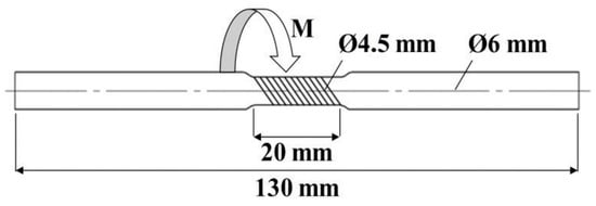 To induce torsional deformation, cylindrical specimens with a reduced gauge section for strain localization were prepared (Figure 1). The specimens, with a length of 130 mm and a central part with a length of 20 mm and a diameter of 4.5 mm, were cut from hot-forged rods with a diameter of 6 mm on a turning lathe.