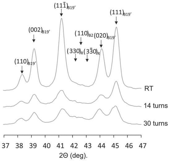 X-ray diffractograms of the samples after the reference treatment (RT) and deformation via torsion for 14 and 30 turns at 500 °C are presented in Figure 2. The X-ray diffraction analysis shows that after the RT was applied, only monoclinic B19′-martensite was present, with some indications of the presence of residual B2-austenite and/or an intermediate R-phase. Generally, the application of torsional deformation did not change the phase composition at room temperature. Some background noise in the 2𝜃 angle range from 42° to 43°, which can be ascribed to the {110} peak of B2-austenite and the doublet rhombohedral of the R-phase, was detected, but the main phase was still B19′ -martensite.