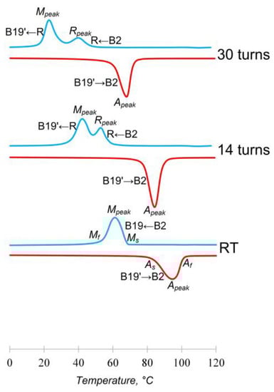 Calorimetric curves of the NiTi SMA before and after deformation are shown in Figure 3. In the initial state, both forward and reverse martensitic transformations proceeded in one stage: B2 → B19′ for cooling and B19′ → B2 for heating. Torsion deformation at 500 °C in 14 and 30 turns led to an increase in internal stresses in the alloy, which stimulated the flow of the forward MT through the intermediate R-phase according to the following two-stage mechanism: B2 → R → B19′ (Figure 3). The change in the stages of transformations was the result of an increase in the defectiveness of the structure due to phase and deformation hardening [,,,,]. The reverse MT after deformation via torsion, however, proceeds in one stage, namely, B19′ → B2, as in the initial state after the RT (Figure 3).