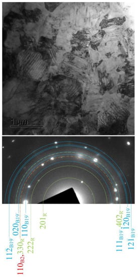 The most characteristic reflections of phases are indexed in the selected area electron diffraction (SAED) pattern taken from the area in the top of Figure 4 and shown in the bottom of Figure 4. Analysis of the SAED pattern after STD indicates that the main phases in the alloy at room temperature are B19′-martensite and the R-phase. The presence of B2-austenite is not clear because its reflections are overlapped by the reflections of the R-phase.