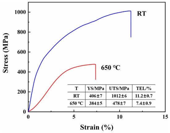 Tensile curves of Super304H ODS steel tested at room temperature and 650 °C, respectively.