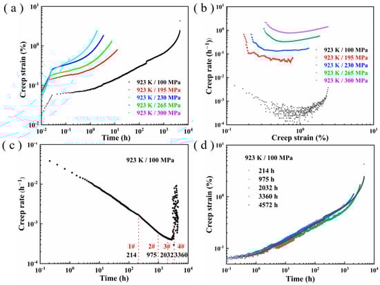 (a) Creep strain versus time curves, (b) creep rate versus creep strain curves, (c) creep rate versus time curve under 100 MPa, and (d) creep strain versus time curves for interrupted samples.