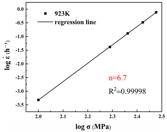 where is a constant, and is the stress exponent to represent different mechanisms of creep deformation. However, it should be noted that, in the ODS steel, the dispersed distribution of precipitates can effectively impede the dislocation motions, displaying threshold stress [27,28]. Hence, the n discussed here actually presents the apparent stress exponent. Figure 5 displays the double logarithmic curve of the minimum creep rate versus stress. The line is well-matched across varied stresses, demonstrating an identical creep deformation mechanism under different stresses. The apparent stress exponent n is calculated to be 6.7, which is close to that reported in 18Cr9Ni and 316LN austenitic stainless steels [26,29]. This suggests that the creep deformation of the Super304H ODS steel is controlled by dislocation motion [30].