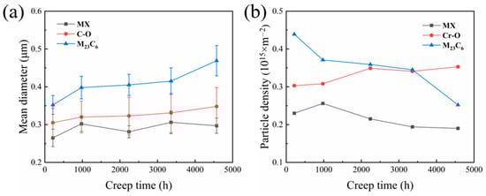 Variation curves of (a) mean diameter and (b) particle density of MX carbides or nitrides, Cr-O oxides, and M23C6 carbides, along with creep time.