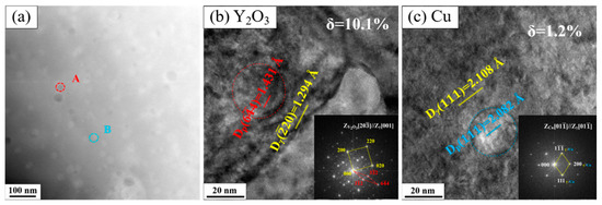 Furthermore, several types of precipitates can be found within the matrix. As can be seen, MX carbon-nitrides with a stable FCC structure are distributed along the grain boundaries (Figure 3b). These precipitates are identified as NbN particles, according to the selected area electron diffraction (SAED) and EDS results, and their mean diameter is about 0.29 μm. Some bright Cr-O particles preferentially precipitate within the UFG region, and their mean diameter is about 0.24 μm (Figure 3c). In addition, some disc-shaped nanoparticles that are dispersedly distributed can be observed within the austenite grain interior (Figure 3d). The mean diameter of these particles is about 9.7 nm, and the number density is 2.6 1015 m−2. According to HAADF-STEM results, two kinds of nanoparticles (marked as A and B) can be identified in Figure 3d. Particle A, exhibiting stronger contrast with the matrix, due to its heavier molar mass, is identified as Y2O3 phase (Figure 3e), and Particle B is characterized as Cu-rich phase (Figure 3f). The lattice misfits () of the Y2O3 and Cu-rich phases with the austenite matrix can be quantified by the following formula [23]: