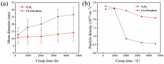 Variation curves of (a) mean diameter and (b) particle density of Cu-rich phases and Y2O3 phases with creep time.