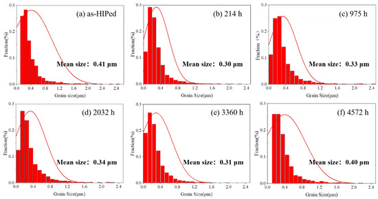 Statistical histograms of grain size distribution for (a) as-HIPed sample and samples in different creep stages: (b) 214 h, (c) 975 h, (d) 2032 h, (e) 3360 h, and (f) 4572 h.