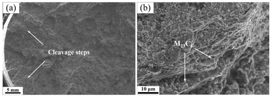Figure 14 shows the fracture morphology after creep rupture of the Super304H ODS steel. It can be seen that only cleavage planes are generated on the fracture surface, suggesting a brittle fracture characteristic. In addition, some M23C6 carbides are also found near grain boundaries, indicating that these particles are the inducements for creep damages [15].