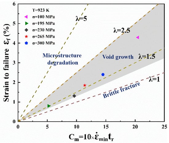 where is the fracture strain, is the minimum creep rate, and is the rupture time. In general, the value of λ for different steels varies from 1 to 20; with the increase of λ value, there is a gradual transition of the fracture mode from brittle fracture to ductile fracture. Specifically, when λ is 1, the fracture mode is determined to be a brittle fracture with a relatively low creep strain; when the value of λ is in the range of 1.5–2.5, the creep damage mode is characterized by cavity growth; when λ exceeds 2.5, the dominant damage mode is shifted to necking because of microstructure degradation.