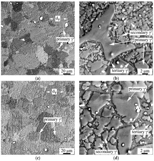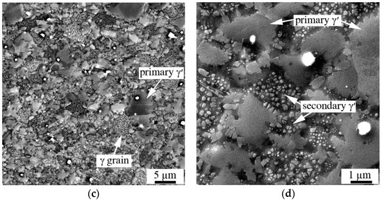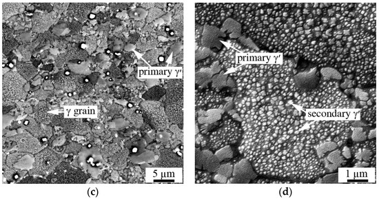 Figure 1c,d represents the microstructural condition obtained after homogenization annealing, which was followed by slow cooling. Annealing led to the growth of γ grains up to dγ ≈ 42 μm, to slight coarsening of the primary γ′ phase along γ grain boundaries up to 5–20 μm and to an increase in the volume fraction of the primary γ′ phase up to about 26%. The secondary and tertiary γ′ phase particles with a size of 0.5–4 μm and smaller than 0.1 μm, respectively, were precipitated within γ grains (Figure 1d). Table 1 shows the microstructural parameters obtained in workpieces of the superalloy in the initial as-HIPed and homogenized conditions.
