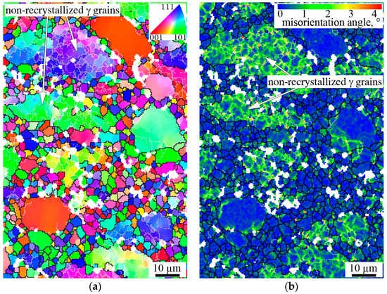 Three forging procedures were applied to reach recrystallized, homogeneous and fine-grained structures with a different γ grain size. As mentioned, all forging procedures were carried out at subsolvus temperatures with intermediate recrystallization annealing as described elsewhere [8] and with decreasing the forging temperature from stage to stage. Microstructure examination showed that all forging processes led to the occurrence of dynamic recovery and recrystallization, resulting in the refinement of the initial microstructure. As was shown in our previous works [5,8,19], the use of fractional forging with intermediate recrystallization annealing and the massive can made of a stainless steel contributed to the formation of a homogeneous recrystallized microstructure throughout the forgings. However, coarse non-recrystallized γ grains with a size of 30–50 µm were also observed in the forgings. By way of illustration, Figure 2 and Figure 3 show the typical EBSD- and corresponding KAM-maps as well as the BSE and SE images of the superalloy after forging at 1225–1200 °C and 1200–1150 °C. Table 1 describes schematically the forging regimes and microstructural conditions obtained after forging. The decrease in the forging temperature led to a finer size of recrystallized γ grains and to higher volume fractions of coarse non-recrystallized γ grains and the primary γ′ phase (Figure 2 and Figure 3). Apparently, a higher volume fraction of the undissolved γ′ phase at lower forging temperatures contributed to the strain localization, leading to an increase in the volume fraction of non-recrystallized γ grains. It is interesting to note an increase in the volume fraction of the coarse primary γ′ phase as the forging temperature decreased. Particularly, the volume fraction of the primary γ′ phase increased from ≈20 to ≈46% when the forging temperature decreased from 1225–1200 to 1200–1150 °C (Table 1). Most likely, the grain/interphase boundaries served as diffusion paths and contributed to the development of coalescence of the primary γ′ phase during forging and intermediate annealing. The fraction of high-angle grain/interphase boundaries was similar and varied in the range of 66.5–70.4%. This also confirms the occurrence of recrystallization processes during forging with intermediate annealing.