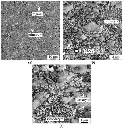 (a,b) BSE and (c) SE images of the superalloy in condition 1 obtained after HIPing, solution heat treatment at 1230 °C and aging. Arrows show the typical γ grain, primary and secondary γ′ phase and carbides.
