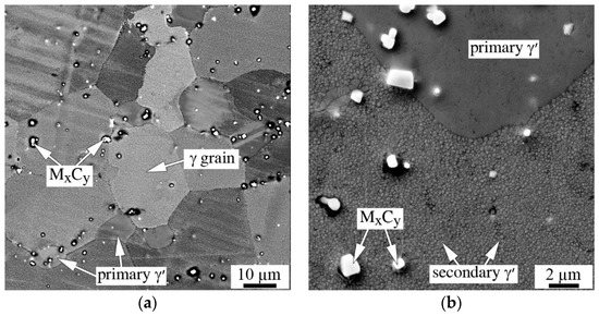 Figure 4 represents the BSE and SE images of condition 1 (Table 2). After solution treatment at 1230 °C and aging, the mean γ grain size was dγ ≈ 33 µm (Figure 4a), the size of the primary γ′ phase located along the γ grain boundaries was in the range of 1–20 µm (Figure 4b), and the size of the secondary γ′ precipitates was in the range of 0.2–0.3 µm (Figure 4c). The volume fraction of the coarse primary γ′ phase was about 7%. In the microstructure, there were coarse and fine carbide particles with sizes of 5–10 and 0.5–1 µm, respectively; their volume fraction was not more than 1%.