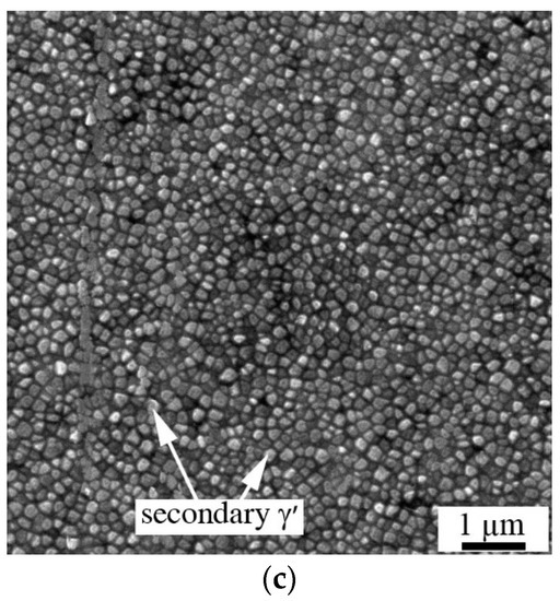 Figure 6 represents the BSE and SE images of condition 5 (Table 2). Post-forging aging did not cause grain growth as solution heat treatment. The mean size of recrystallized γ grains remained dγ ≈ 4 µm, as was after forging (Figure 6a). The size of the primary γ′ phase was in the range of 1–20 µm (Figure 6b), and its volume fraction was about 20%. The size of the secondary and tertiary γ′ precipitates was in the range of 0.05–0.3 µm (Figure 6c). The size and the volume fraction of carbide particles were approximately the same as in the previous conditions.