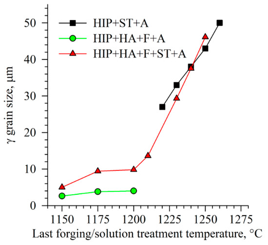 Dependences of the mean size of recrystallized γ grains or the mean γ grain size on the last forging temperature and/or the solution treatment temperature obtained for the superalloy after different processing (HIP—hot isostatic pressing; ST—solid solution treatment; A—aging; HA—homogenization annealing; F—forging at different temperatures with intermediate annealing).