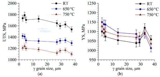 - Irrespective of the γ grain size, the ductility decreased with increasing the test temperature from 20 to 750 °C (Figure 9c). The reason for the decrease in ductility is not completely clear. Note that a similar effect was also observed in some other superalloys, particularly in Inconel 718 [23,24].