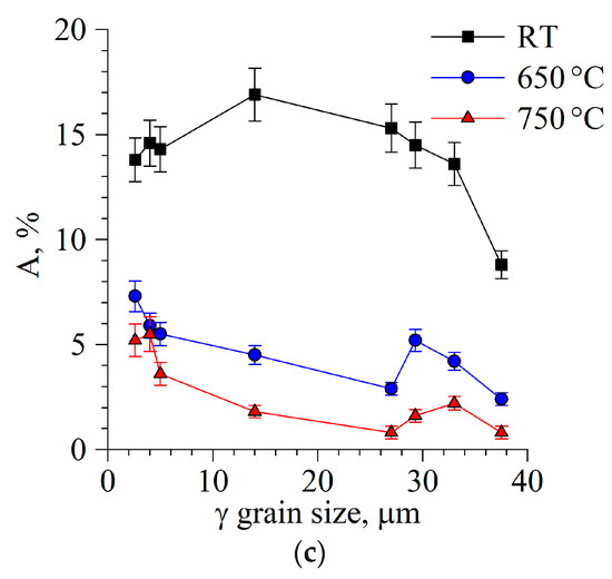 The averaged results of tensile tests as the dependences on the γ grain size: (a) UTS—ultimate tensile strength; (b) YS—yield strength; (c) A—elongation to rupture.