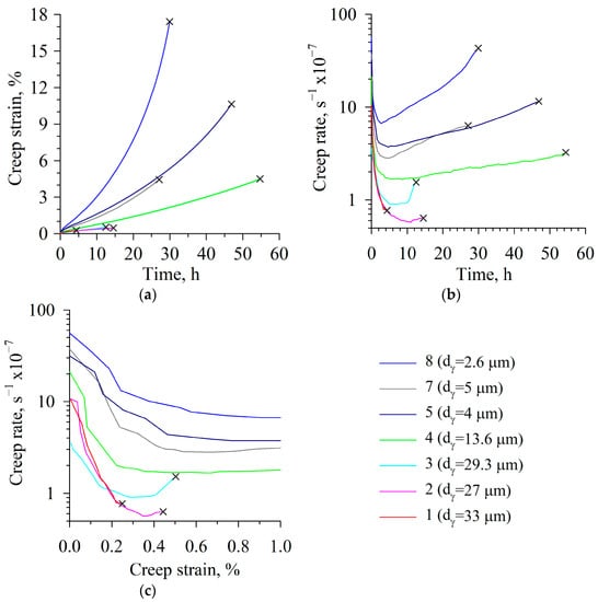 Figure 10 shows the creep curves obtained for conditions 1–5, 7 and 8 at 750 °C/765 MPa. Condition 6, which showed the lowest tensile properties, was not tested. The creep rate significantly decreased at the transition from fine-grained (dγ = 2.6–5 µm) to coarse-grained conditions (dγ = 27–33 µm). Condition 4 (dγ ≈ 13.6 µm) showed the creep rate, which was very close to those obtained for coarse-grained conditions. Considering the creep properties, the following observations can be made: