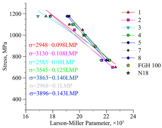 The regression Larson–Miller equations of the superalloy are given from creep life ranging from 650 to 750 °C at different stresses (700–1178 MPa). A Larson–Miller parameter (LMP) relationship was calculated by the following equation [16,17,18]: