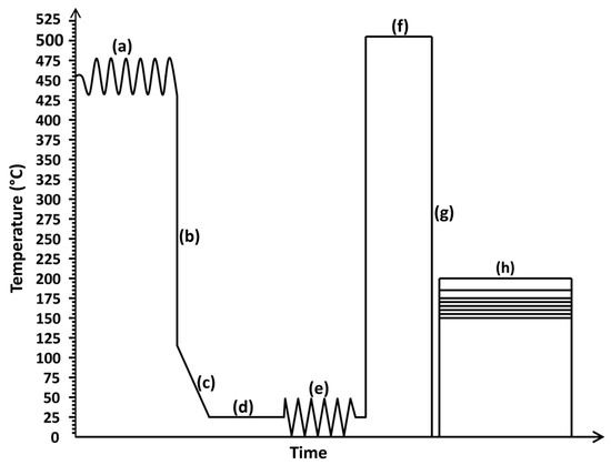 In university laboratories, 100 and 300 mm length samples were cut through the transverse direction using the Linear Precision Saw, IsoMet 5000, Buehler (Lake Bluff, IL, USA). Samples were then solution heat treated in a Carbolite Muffle furnace (Carbolite Gero, Hope, Derbyshire, UK) at 510 °C for 1 h. Solution heat treatment allows dissolution of intermetallic particles and solute atoms in the matrix and removes the effects of hot and cold workings [28]. Solution heat treatment was directly followed by quenching in water with ice at 0 °C such that solute atoms and vacancies are retained in a supersaturated solid solution. The retained solute atoms and vacancies will assist a subsequent precipitation hardening. The supersaturated solid solution microstructure was then artificially aged at temperatures between 150 and 200 °C for times between 2 to 30 h in a Carbolite PF Oven (Carbolite Gero, Hope, Derbyshire, UK). The sample that was neither solution heat treated, nor precipitation heat treated is labeled “as-received”, while the sample that was only solution heat treated is labeled “as-solutionized”. The samples that were solution heat treated and precipitation heat treated are labeled using the precipitation temperature and precipitation time (150-2, 150-13, etc.). The temperature–time chart and details of the process are shown in Figure 1 and listed in Table 2, respectively.