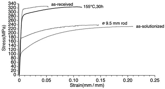 Stress–strain curves of the sample 155-30 as compared to the ø 9.5 mm rod, the as-received, and the as-solutionized.