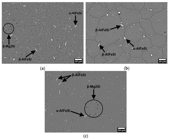 Scanning electron micrographs of the microstructure of the (a) as-received, (b) as-solutionized, and (c) 155-30 samples, type backscattered electrons (BSE), at the magnification, 1000×.