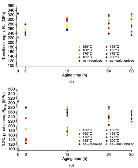 The precipitation state can be extracted using the strength behavior with aging time and temperature (Figure 7a). At the aging temperatures 150 °C and 155 °C and during the aging time 2–30 h, precipitates transformed from GPZ (Gunier Preston zones)-I to GPZ-II and subsequently to the needle-like, coherent β″-Mg2Si. The increase in strength with aging time is associated with the nucleation and growth of GPZ-I and GPZ-II (underaged) up to (peak), which is associated with the presence of the needle-like, coherent β″-Mg2Si. However, 30 h of aging at both temperatures was not enough for precipitates to transform (become coarser) into the semi-coherent, rod-like β′-Mg2Si and subsequently to the non-coherent, rod-like, stable β-Mg2Si; a longer aging time may be needed. A reduction in strength after the peak implies precipitate coarsening. At the aging temperatures 160, 165, and 175 °C, the peak value was obtained after 24 h, and thereafter, β″-Mg2Si transformed into β′-Mg2Si (overaged). The β″-Mg2Si transformation into β′-Mg2Si occurs after 13 h of aging at the temperatures 170 and 185 °C and within only two hours at 200 °C. The β′-Mg2Si transformation into β-Mg2Si (overaged) may occur, and is more likely at high temperatures.