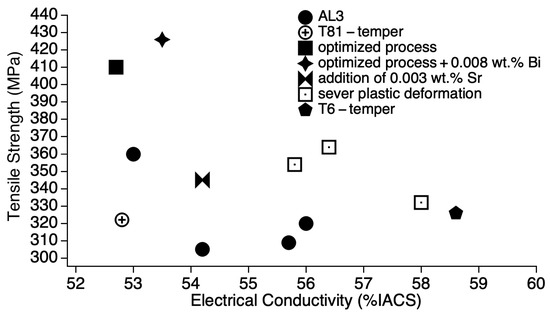 Flores et al. and Jin et al. [10,11] suggested that cold working may be performed after solution and artificial aging treatments, to retain the effect of cold working hence obtain high mechanical properties (also known as the optimized thermomechanical process). The resulting tensile strength was as high as 424 MPa, however, electrical conductivity, 52.78% IACS, was lower than the minimum value [10,11]. Mulazimoglu et al. [12] added a low concentration of Sr, high tensile strength, 345 MPa, and a medium electrical conductivity, 54.2% IACS, was obtained.