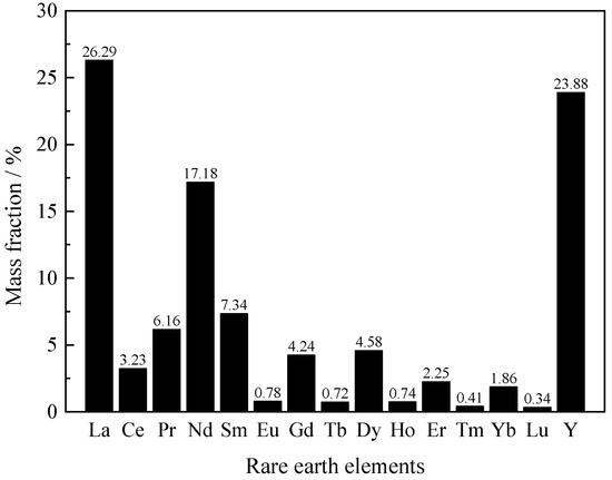 As can be seen from Figure 1, the content of light rare earths was 52.89% of the total rare earth content. The remaining medium and heavy rare earths accounted for 47.11%. The contents of terbium, dysprosium, and lutetium were 0.72%, 4.58%, and 0.34%, respectively, which were higher than the standard ore value, indicating the high utilization value of rare earth.