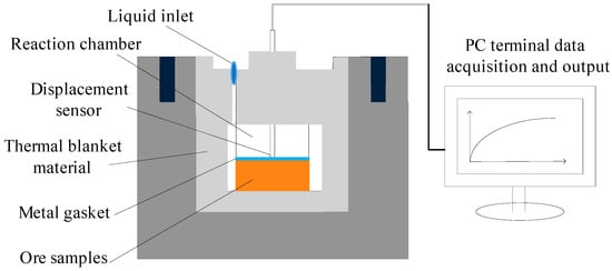 All the chemicals in this study were of analytical grade. In total, 100.00 g of dried ore sample was put into a beaker using a quartering method. Ammonium salt leaching agents with a concentration of 0.20 mol/L were added at a liquid–solid ratio of 2:1, and the leaching agents were stirred at a rotational speed of 240 r/min, as shown in Figure 2. The rare earth concentrations were determined using ICP-MS. Ore samples’ zeta potentials were detected by the Zetasizer Nano. The thermal gravimetric analyzer was used to analyze the ore sample water contents. The temperature growth rate was 10 °C/min, the protective gas was nitrogen, and the test temperature range was 30~1000 °C. The PCY-type intelligent clay dilatometer (as shown in Figure 3) was used to detect the swelling ratio of clay minerals, which was represented by δ. The swelling ratio of the ore sample was measured using the following formula [24]:
