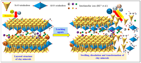 The leaching process of the weathered crust elution-deposited rare earth ore includes the ion exchange process, and the swelling and dissolution of clay minerals. Compared with the weathering process in natural mineralization, the leaching process of the weathered crust elution-deposited rare earth ore can be regarded as a kind of artificial weathering process. Adding different leaching agents in the rare earth leaching process leads to a series of effects on the swelling and dissolution of clay minerals. The process is illustrated in Figure 4.