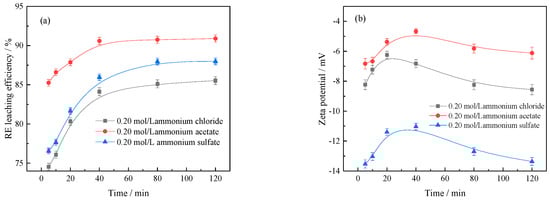 In order to explore the effects of ammonium salt leaching agents on the rare earth leaching efficiency, 0.20 mol/L ammonium acetate, ammonium sulfate, and ammonium chloride were used as leaching agents. The rare earth leaching solution at different time periods was collected, the rare earth leaching efficiency was calculated, and the zeta potential of the mineral surface was detected. The rare earth leaching process is the process of the ion exchange reaction between rare earth ions and leaching agent cations, and the occurrence of this process was accompanied by a change in zeta potential on the surface of the clay minerals. Therefore, it was necessary to discuss the change in zeta potential on the surface of the clay minerals while exploring the rare earth leaching efficiency. The results are shown in Figure 5.