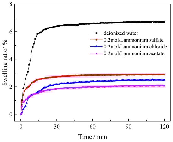 In order to explore the effects of leaching agents on the swelling ratio of clay minerals in the rare earth leaching process, the clay mineral swelling ratios in deionized water, ammonium chloride, ammonium sulfate, and ammonium acetate solutions were calculated. The results are shown in Figure 6.