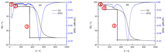 The evolution of clay minerals always occurred in contact with pore water, and the formation transformation of clay minerals was controlled by the leaching of aqueous medium [31,32,33]. In order to verify the transformation of clay minerals in the rare earth leaching process, the water retention properties of ore samples after the action of different leaching agents were analyzed using a thermogravimetric analyzer. The differences in the adsorption water relative contents, interlayer water, and constitution water of clay minerals were discussed, and the results are shown in Figure 7 and Table 2.