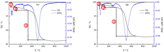Thermogravimetric curves of ore samples under different leaching agents. (a) Raw ore; (b) ore sample with the ammonium chloride as leaching agent; (c) ore sample with the ammonium sulfate as leaching agent; (d) ore sample with the ammonium acetate as leaching agent; ① ② ③ represents the three weightless regions of the ore sample.
