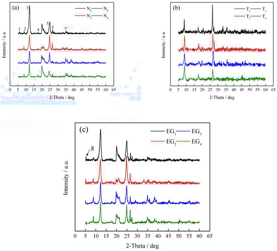 The XRD patterns of clay mineral. (a) Natural sheets; (b) heated sheets; (c) ethylene-glycol-saturated sheets. N1–N4 (T1–T4, EG1–EG4) represent the spectrum of raw ore, and tailings after the actions of ammonium chloride, ammonium sulfate and ammonium acetate.